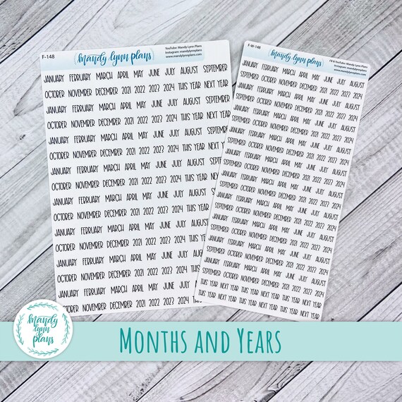 Months and Years 2021, 2022, 2023, 2024 Script Stickers Removable